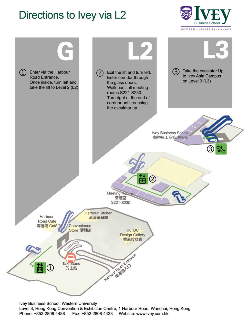 - Take the escalator up to Ivey Asia Campus on Level 3 (L3).